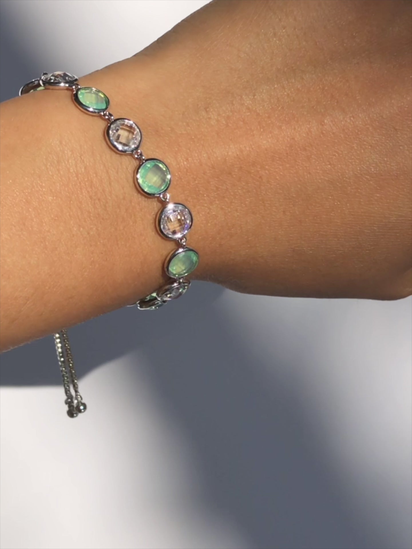 Glamorize your wrist with this Baby Blue Bracelet, featuring bright blue opal crystals paired with clear crystals for a luxuriously sparkling finish. The adjustable chain is gracefully adorned with a smooth silicone-ringed bead that adjusts to fit any wrist effortlessly. Perfectly plated with an alluring rhodium finish, this timeless piece of jewelry will captivate you with its alluring beauty and charm. Pair it with our other Baby Blue pieces to complete the look :)