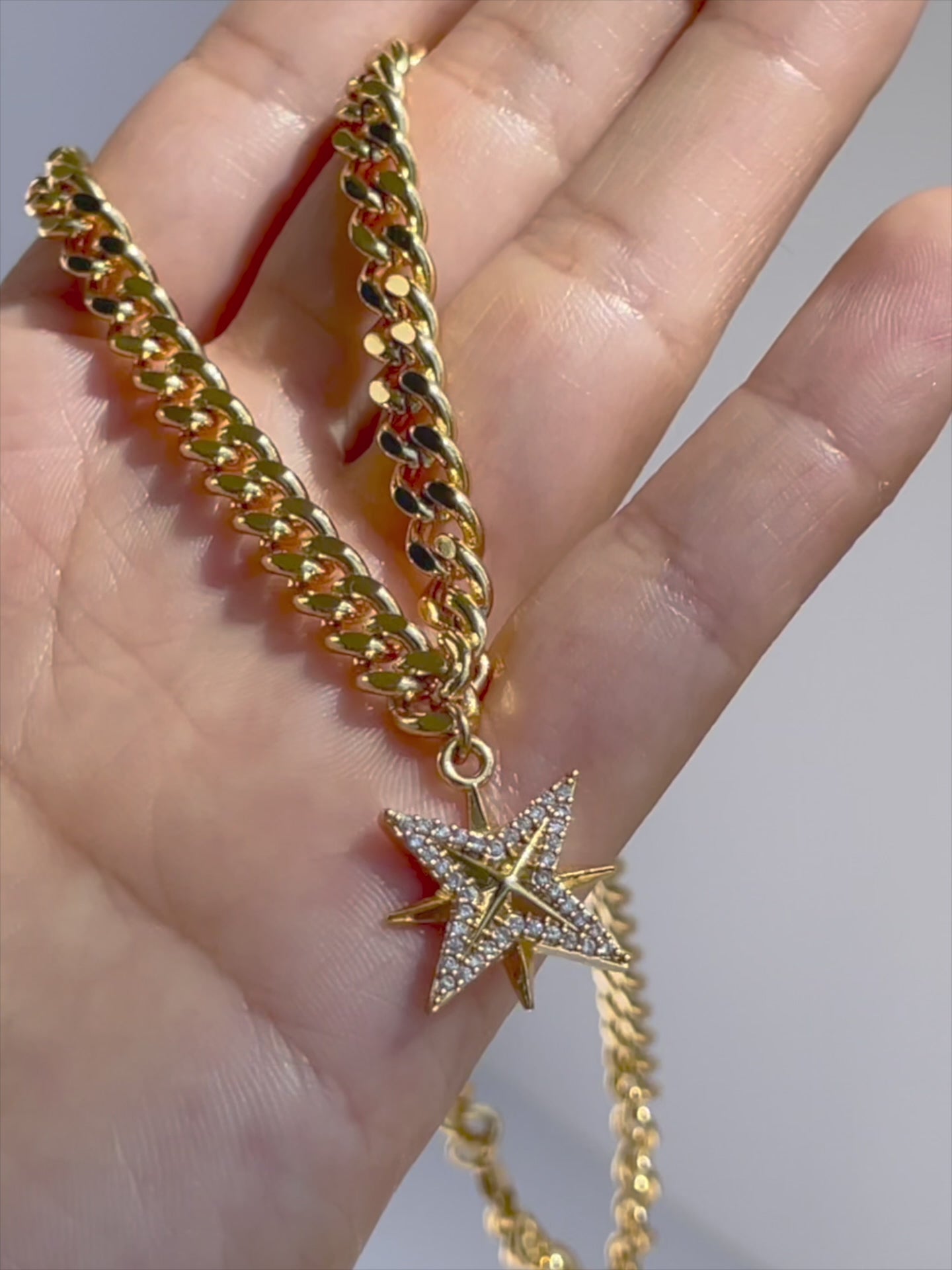 Bring out your inner 70's starlet and make a fashion statement with this striking Chunky Star Necklace! This bold and eye-catching piece exudes a retro vibe with its chunky chain, shimmering crystals, and statement-making golden star pendant. Pair it with the matching earrings, let your lucky stars add a little sparkle to your day, and show off your star power!