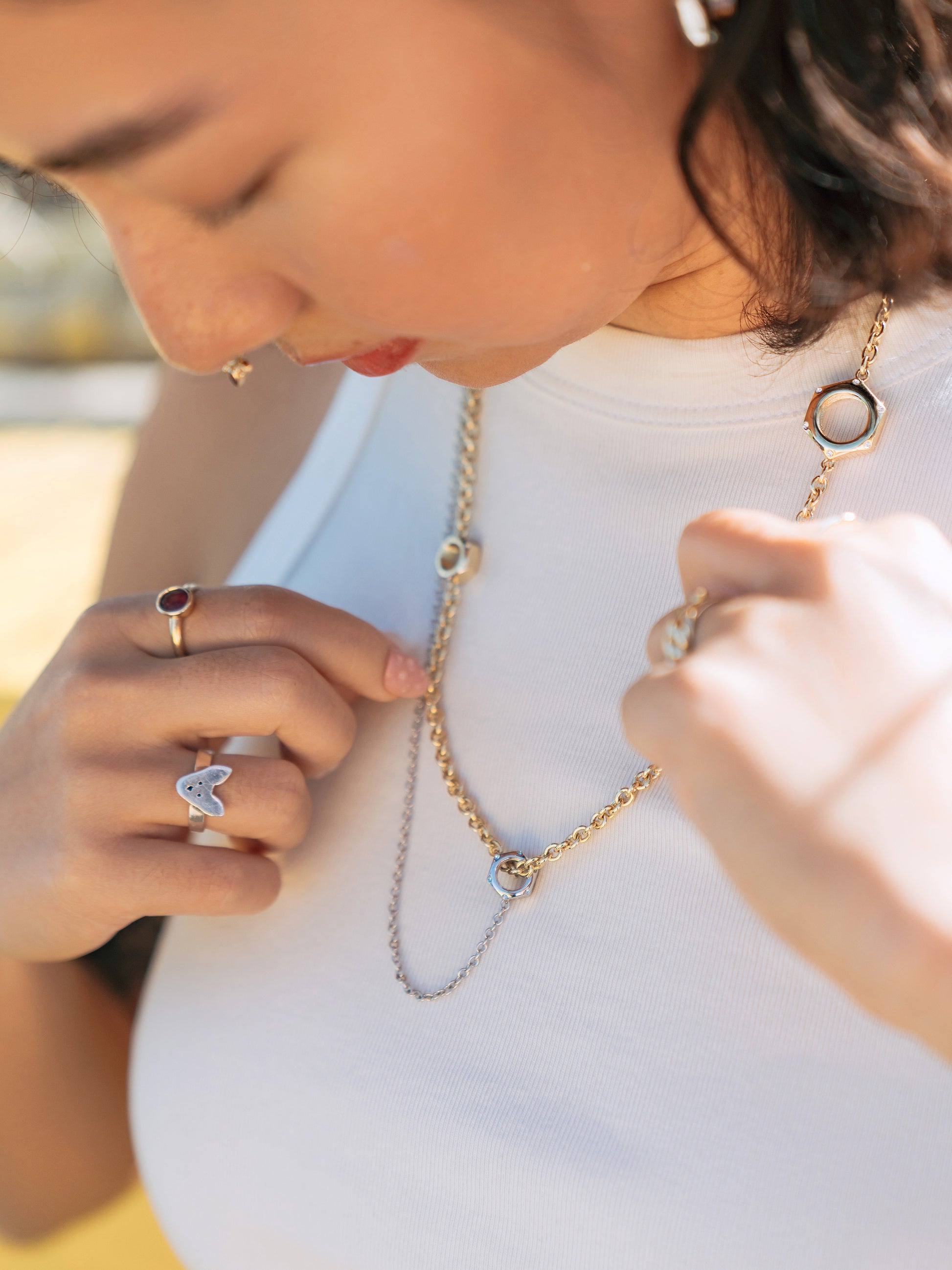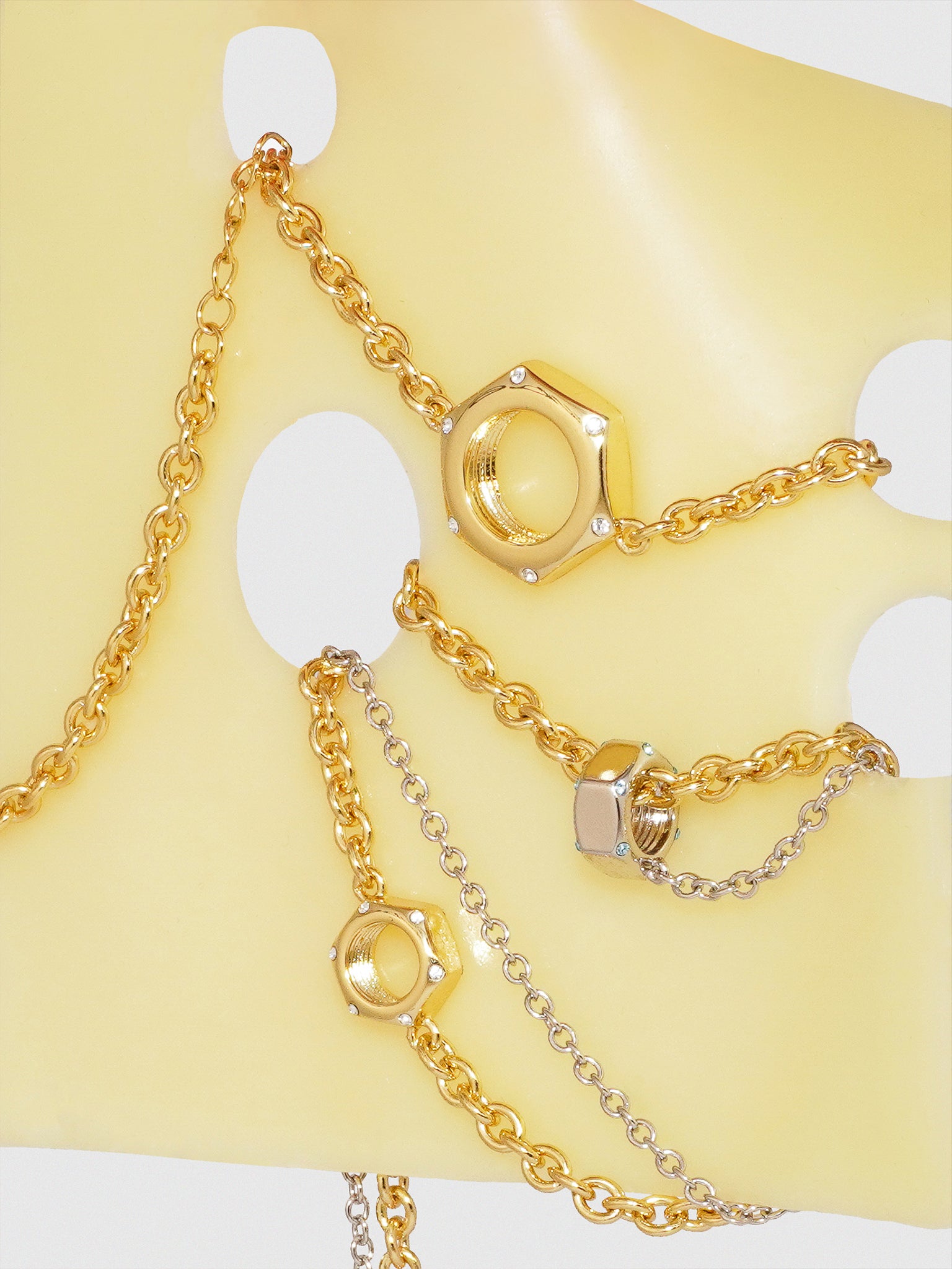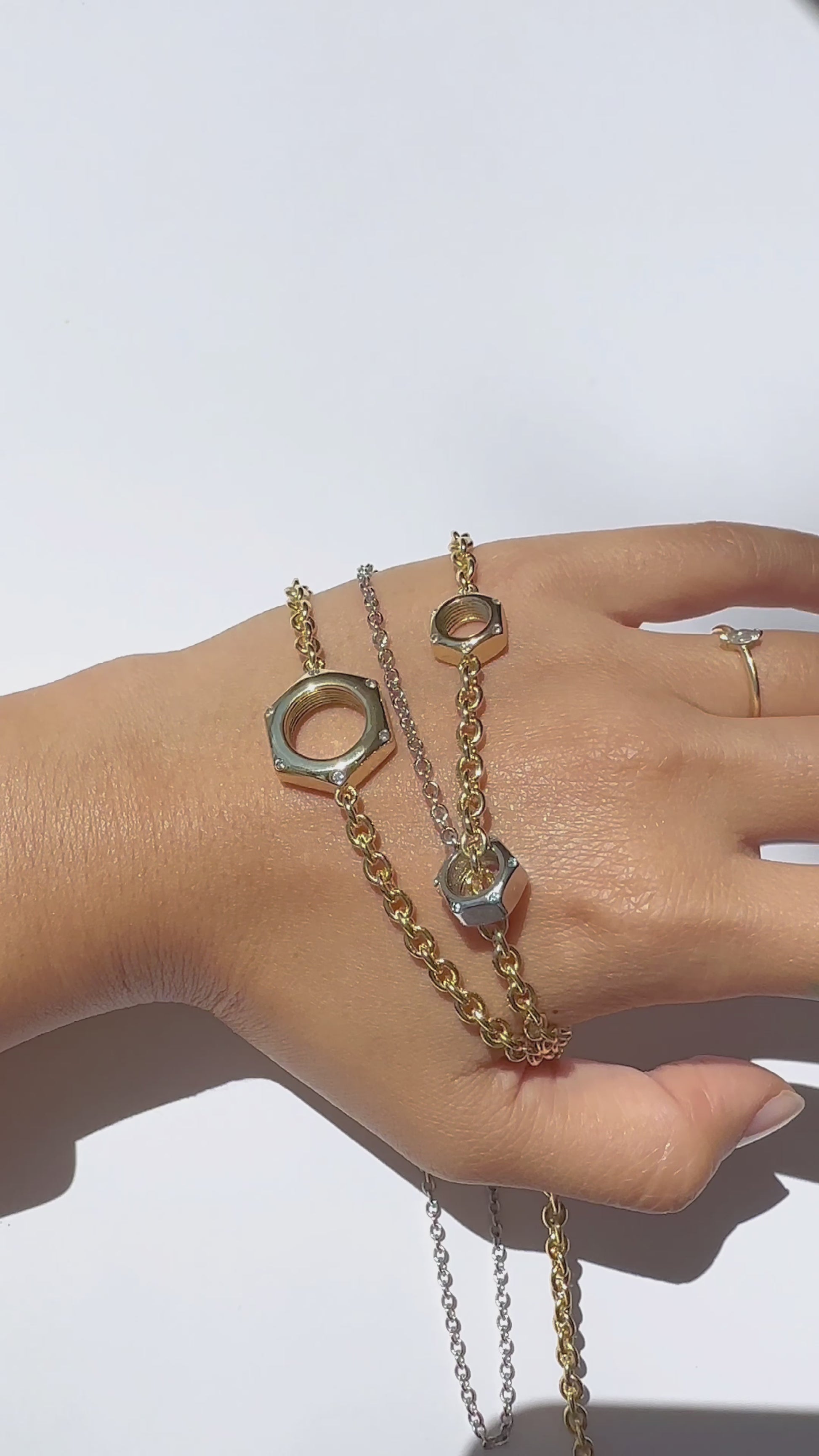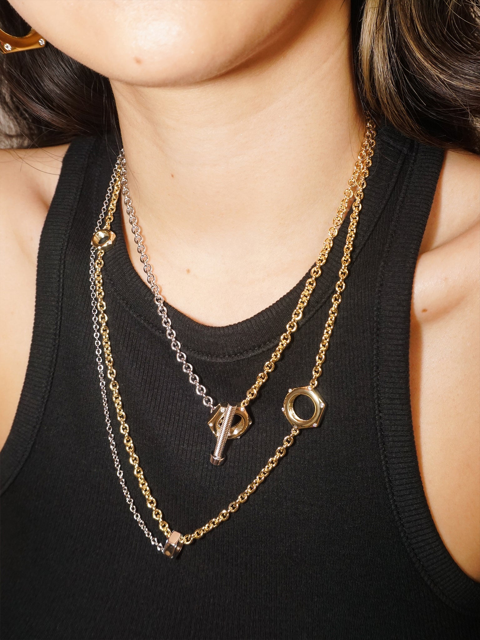 Three hex nuts—each a little industrial, a little edgy—come together in a design that’s as flexible as you are. The sliding center nut lets you customize how 'double-layered' you want your look to be, making this necklace as dynamic and personal as the person wearing it.