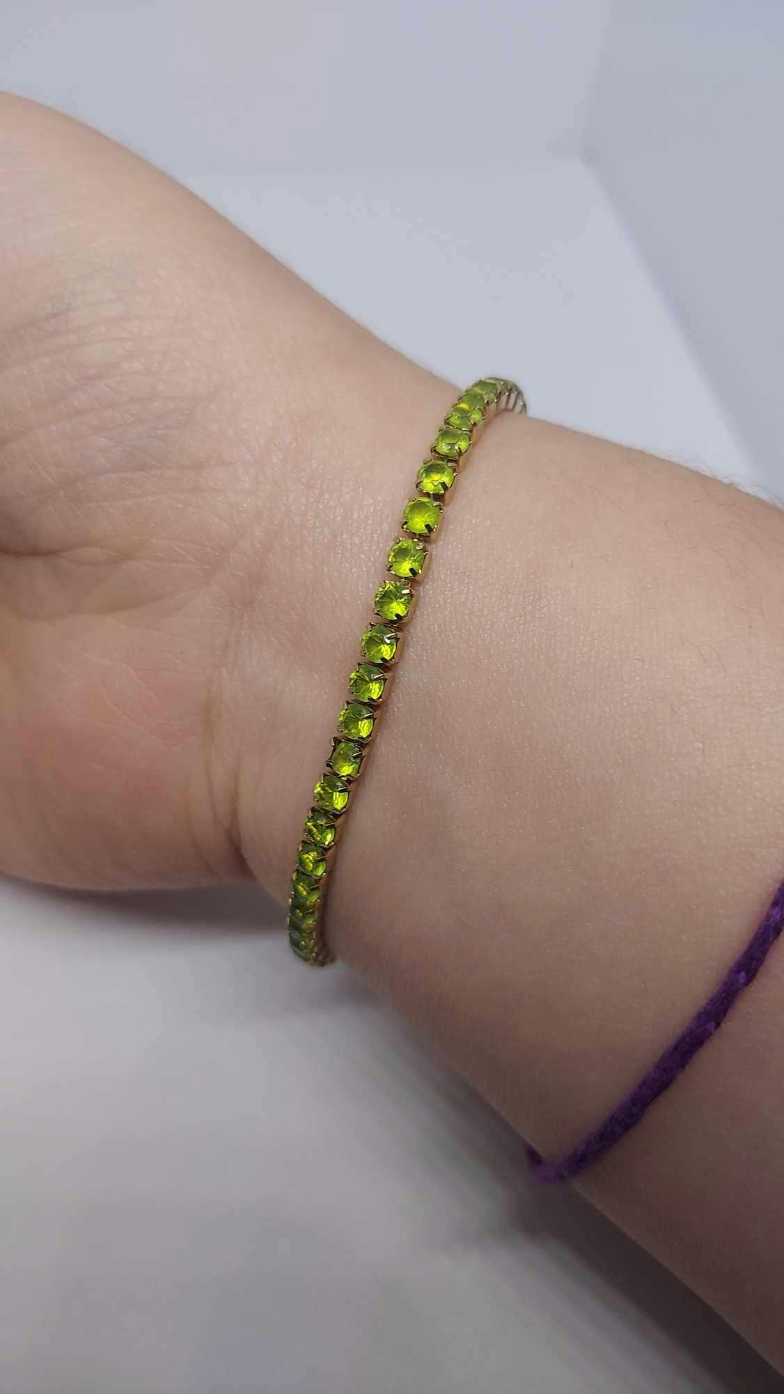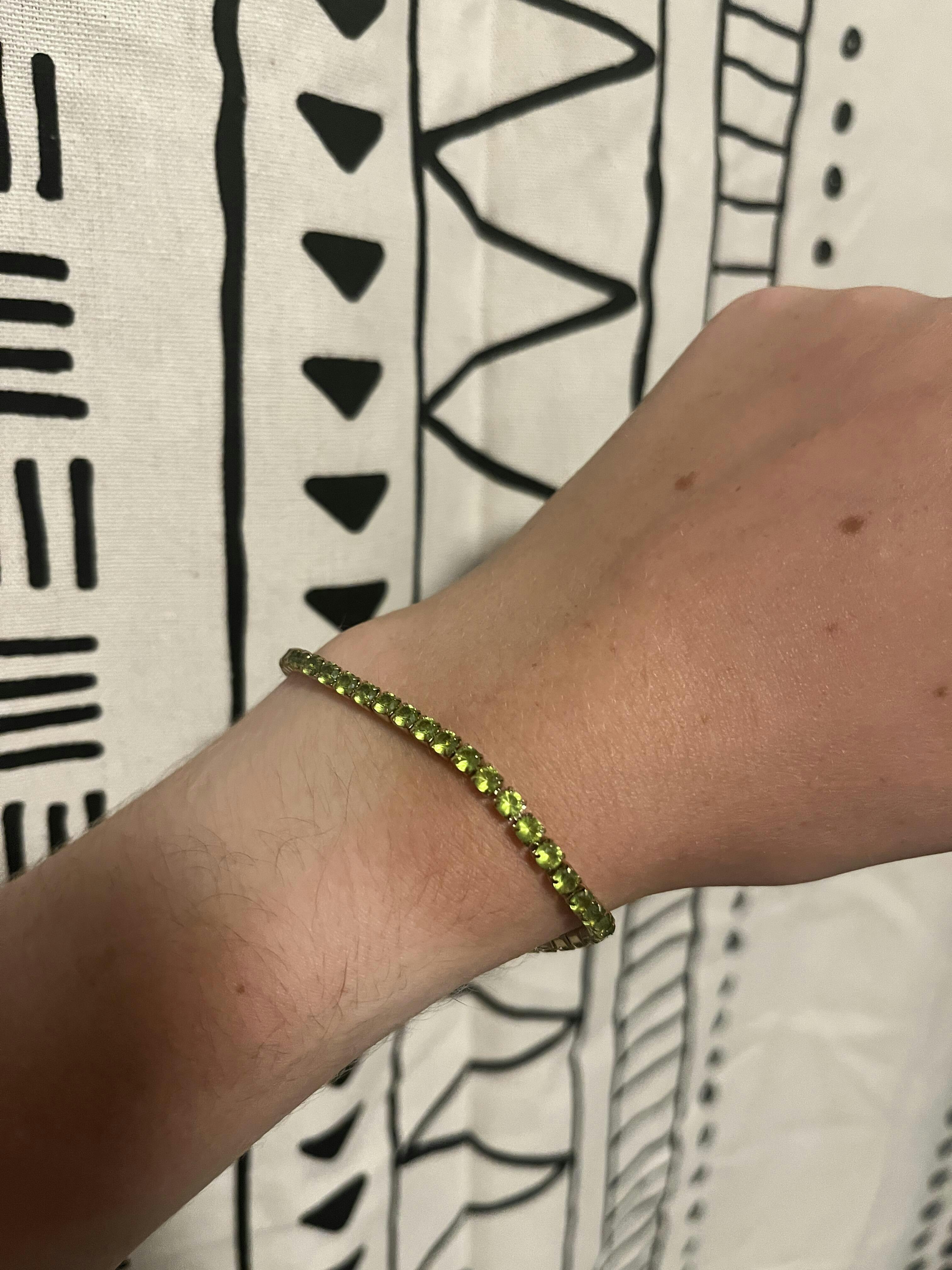 Add some extra sparkle to your style with this Green Tennis Bracelet. Crafted with premium 316L stainless steel and PVD coated with 18K gold, it is waterproof and won't turn your skin green, making it perfect for everyday wear or stacking with your favorite watch. Or, for special occasions like pool parties, this bracelet will stand up to all the pool dips. Stack it with our White Tennis Bracelet or pair it with the matching choker for a complete look :)