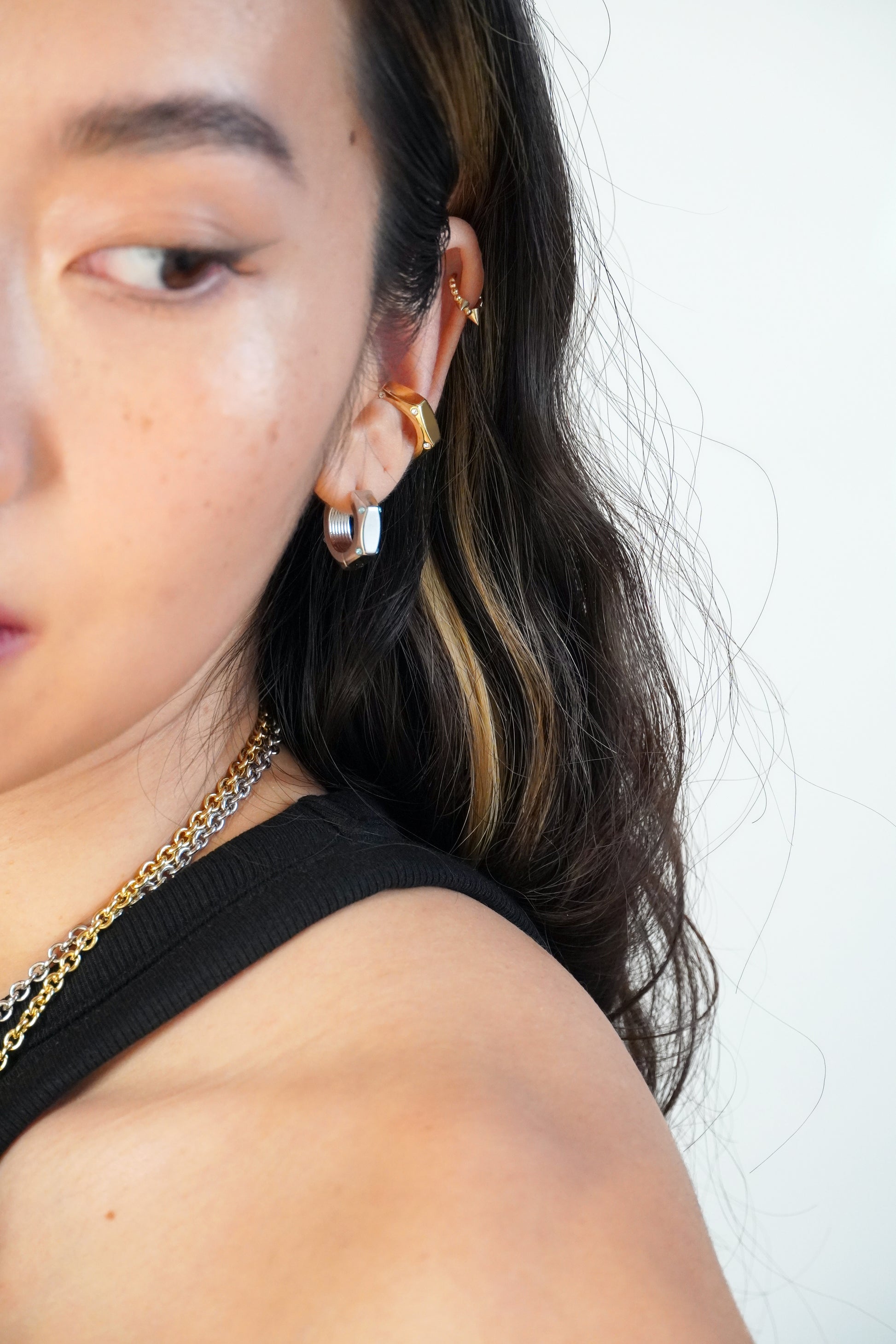 The Hex Nut Ear Cuff is designed to hug your ear securely, offering a comfortable fit that stays in place all day. Crafted from high-polished 14K gold and adorned with Swarovski® crystals, it adds a touch of luxury without the need for a piercing. Its sleek, ear-hugging shape makes a striking statement while staying effortlessly in place—perfect for those who appreciate both form and function.