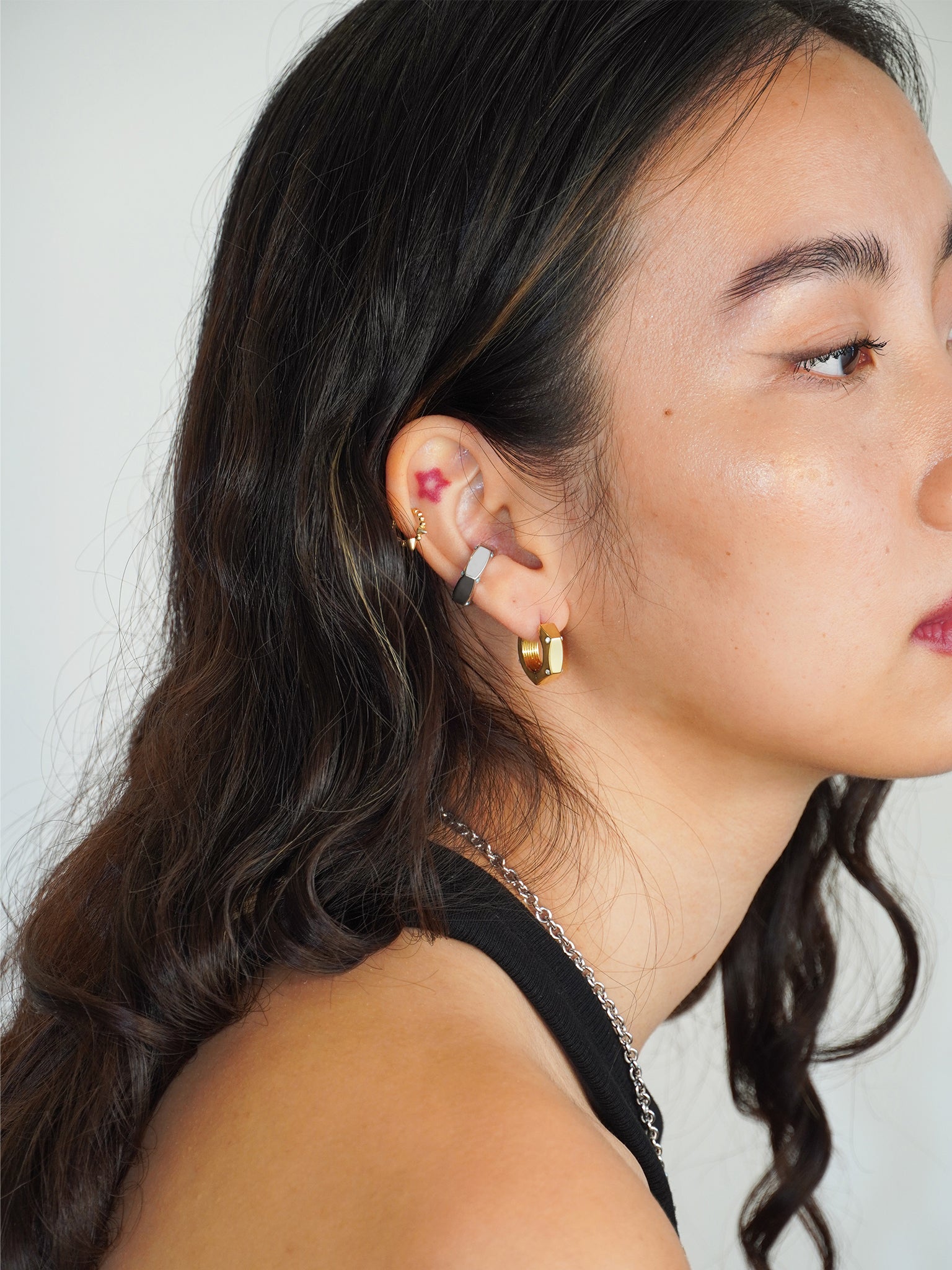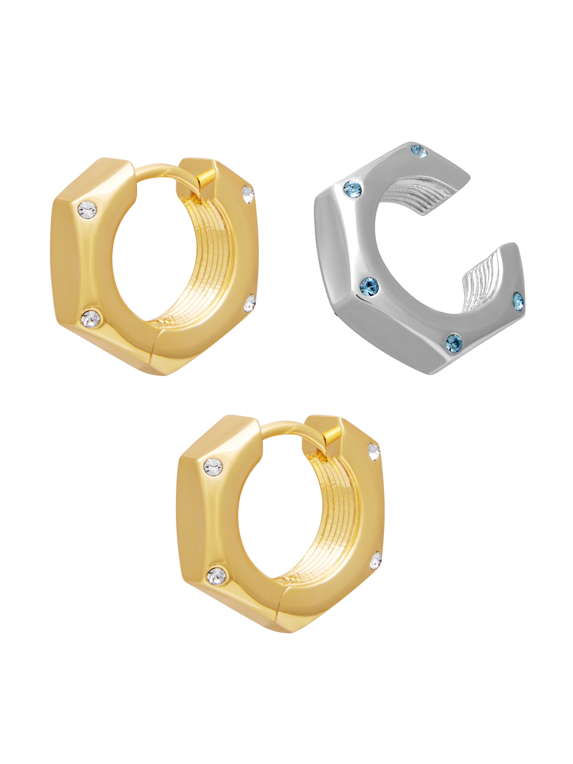 The Hex Nut Ear Cuff is crafted with the same high-polished finish and Swarovski® crystals, designed to hug your ear securely and stay in place all day—offering luxury and style without the need for a piercing.