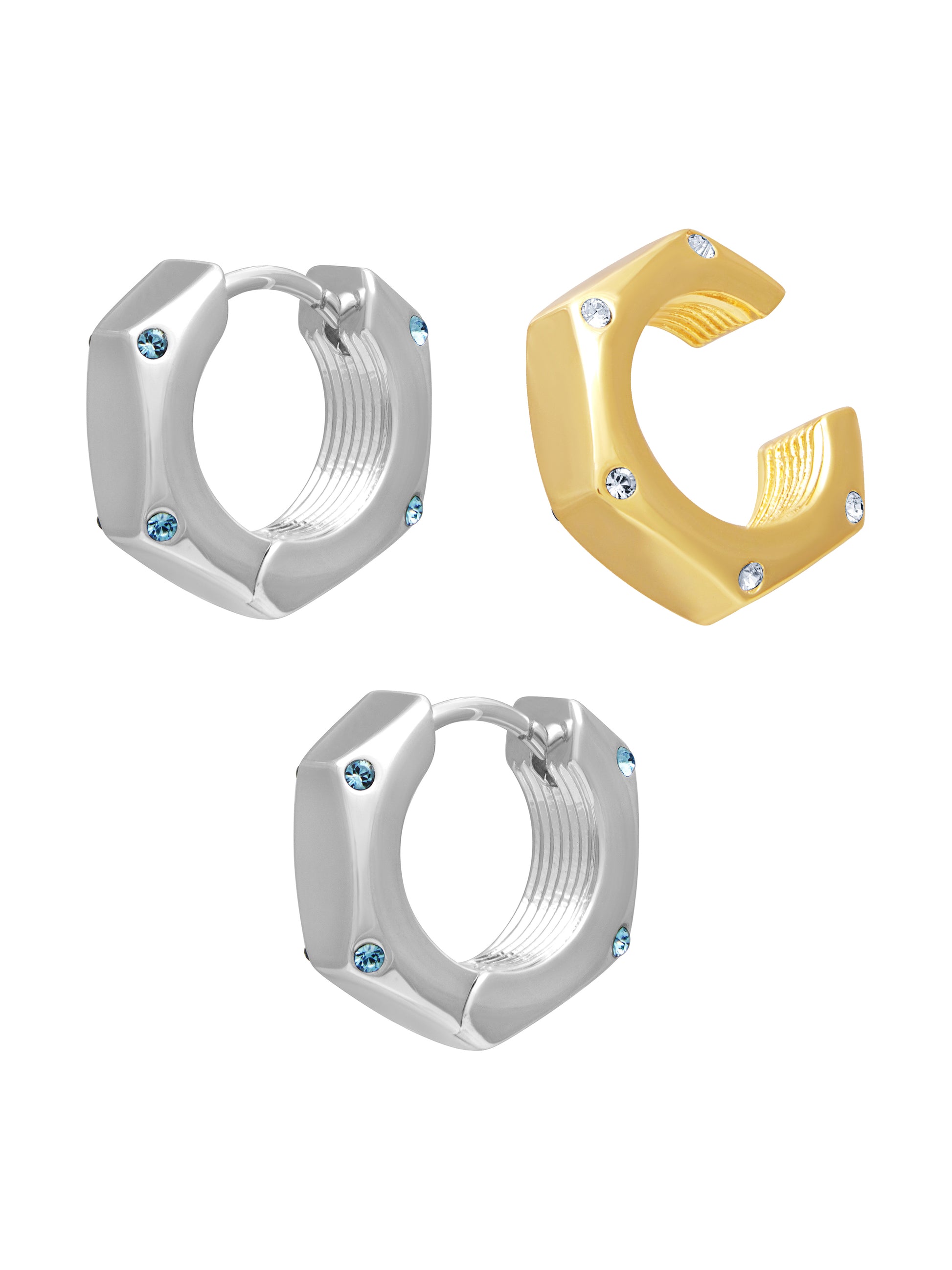 Time to mix and match! This bundle includes the bold Link-Up Hex Nut Huggie Earrings and the sleek Hex Nut Ear Cuff—both inspired by the humble hex nut and designed to add industrial edge to your look.