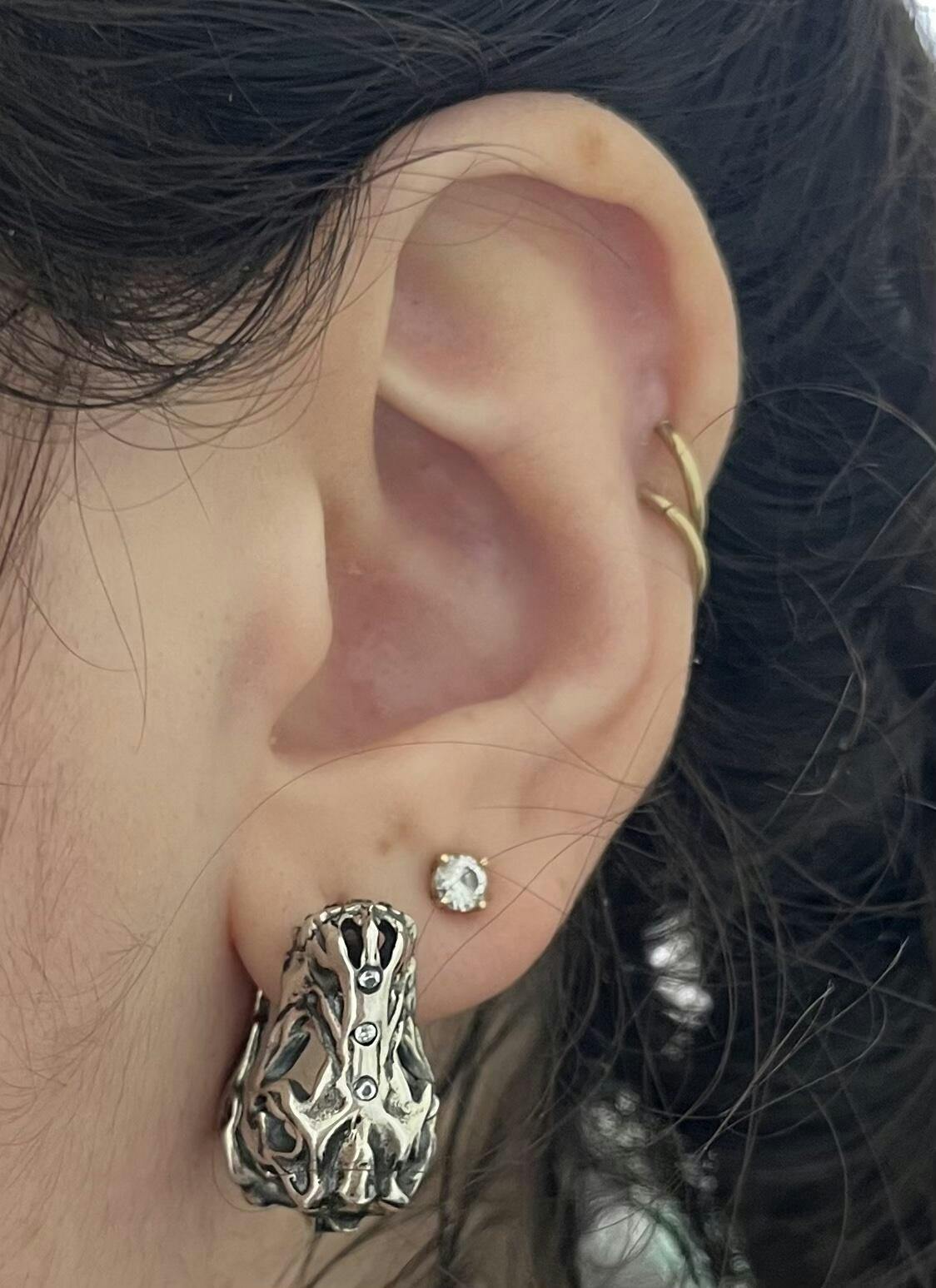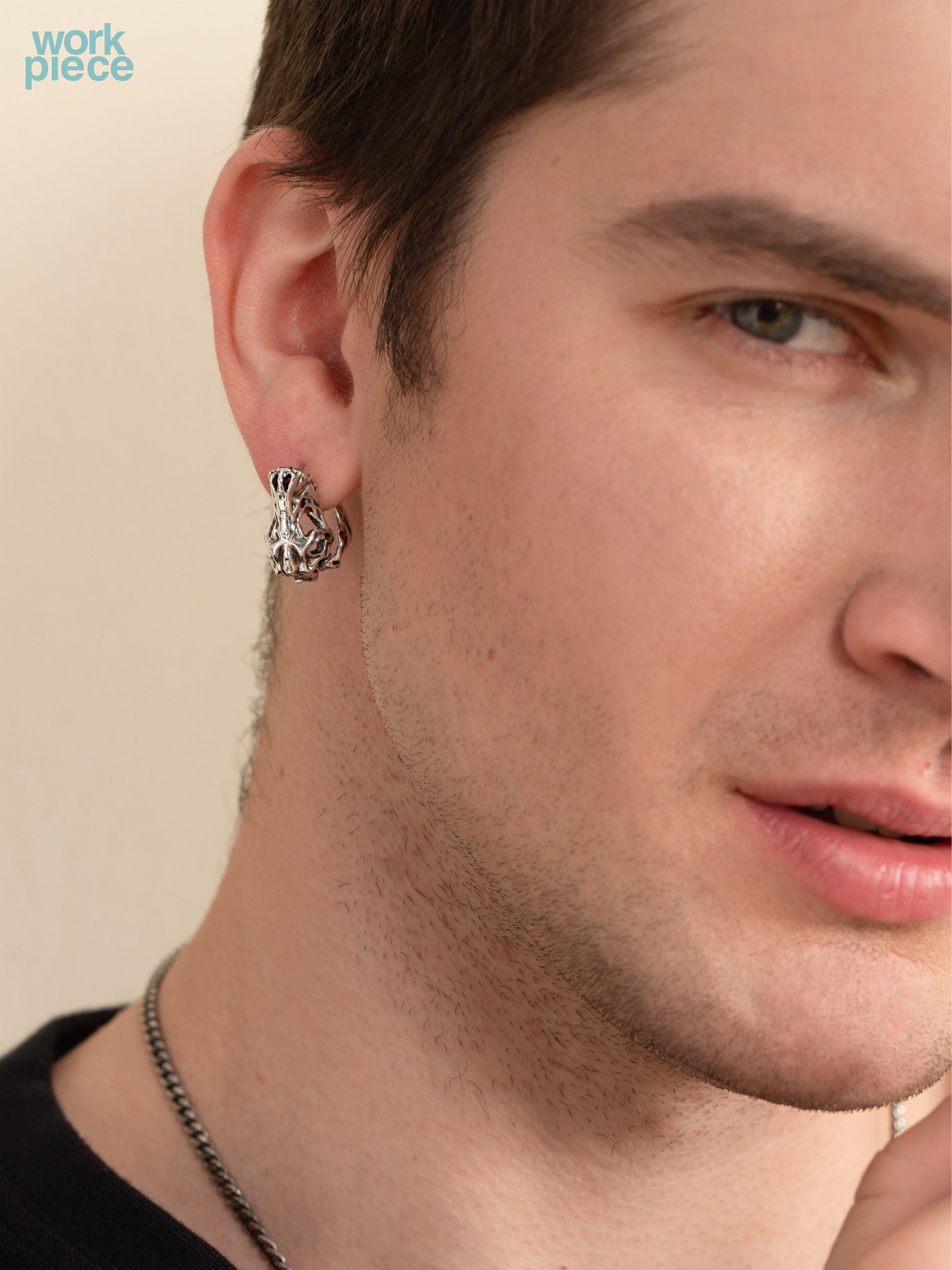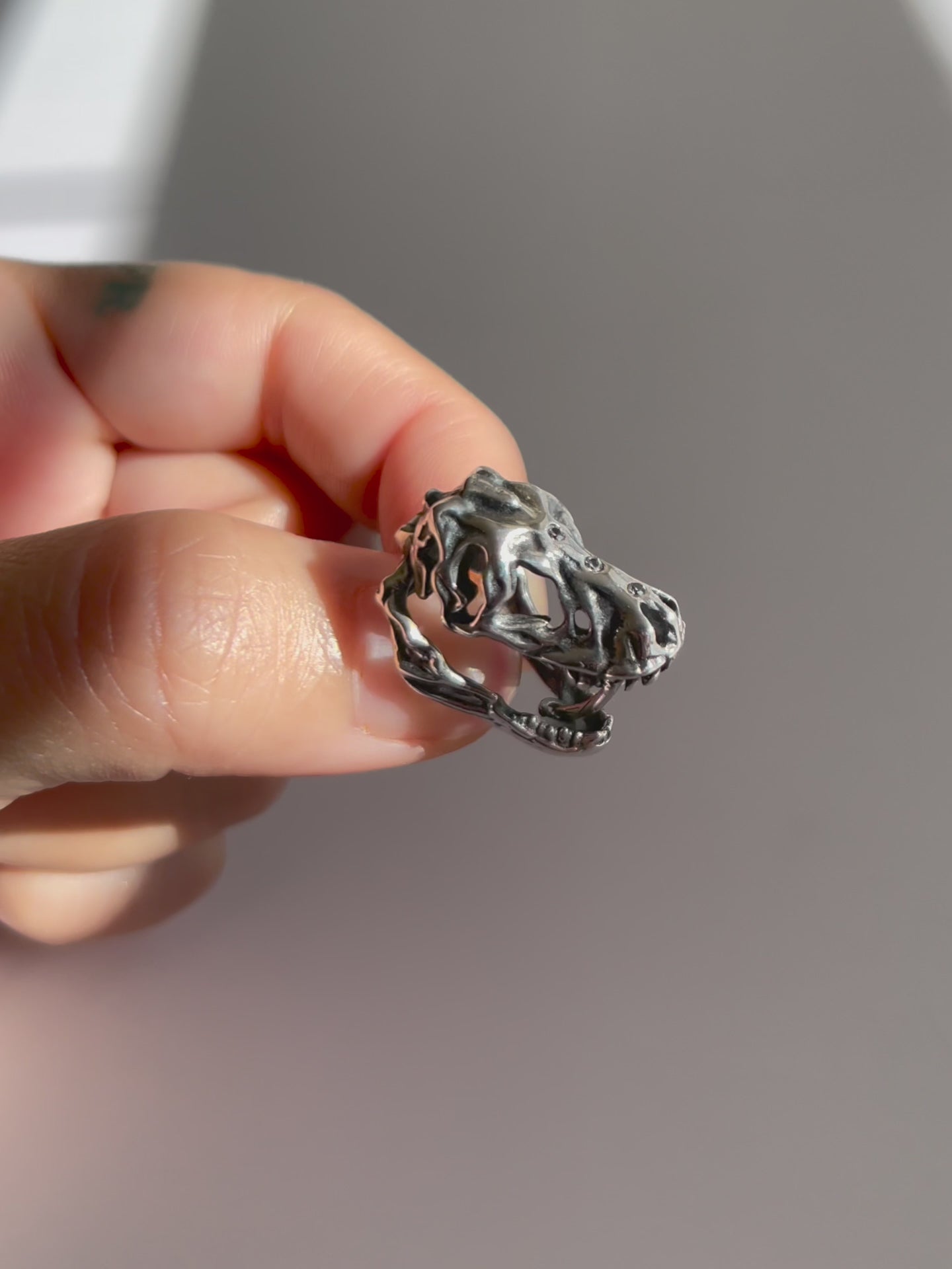 These handcrafted earrings are made of recycled 925 silver with an oxidized finish, adorned with three shimmering white CZ crystals on each one. Our detailed replica of a T. rex skull offers a realistic and eye-catching design, while the innovative hook structure allows it to be tucked inside the mouth, giving the illusion of the T. rex "biting" your ears. Don't forget to pair them with the bold and cool matching necklace! Complete your dinosaur-inspired look with this unique and stylish set.