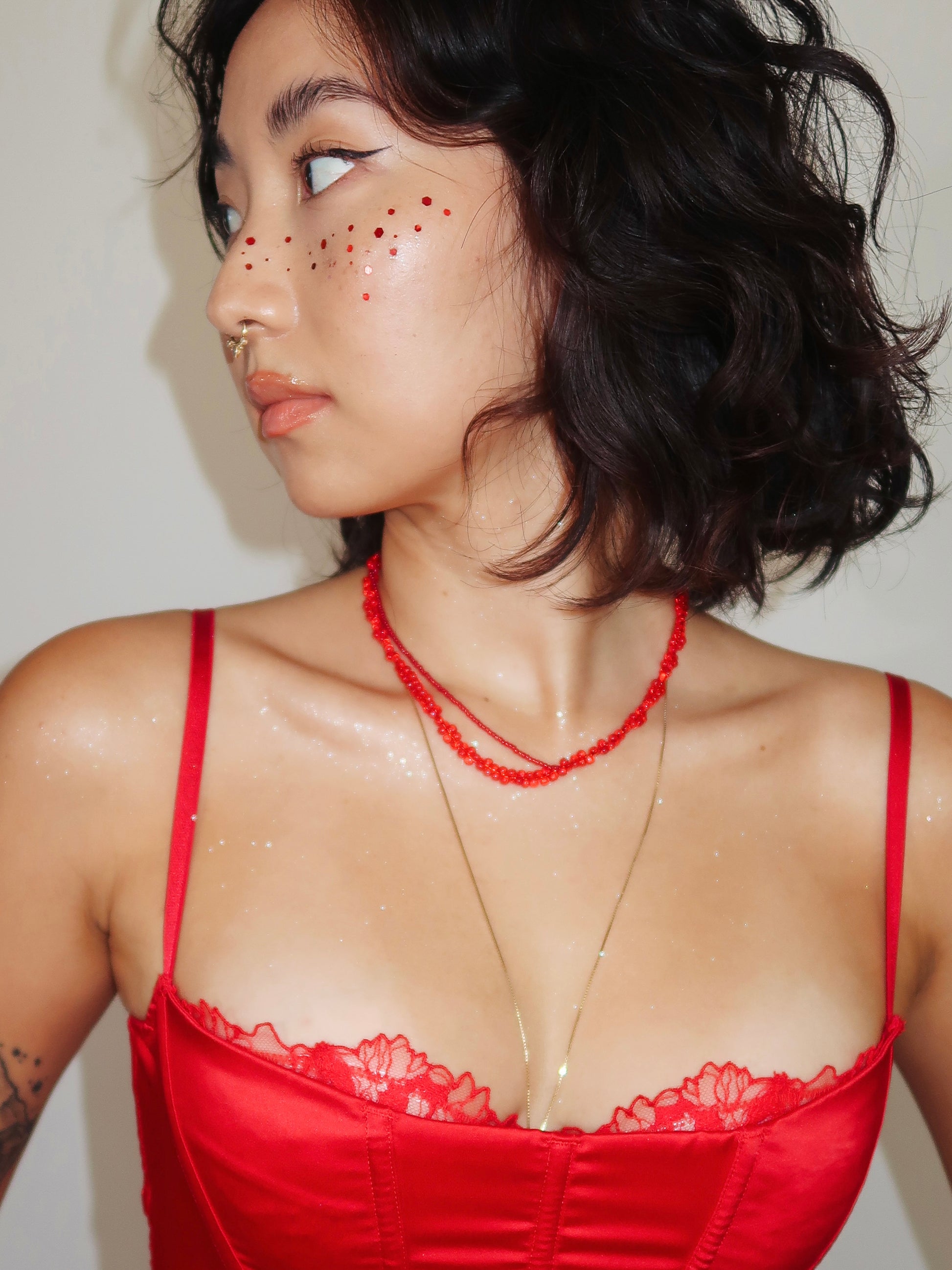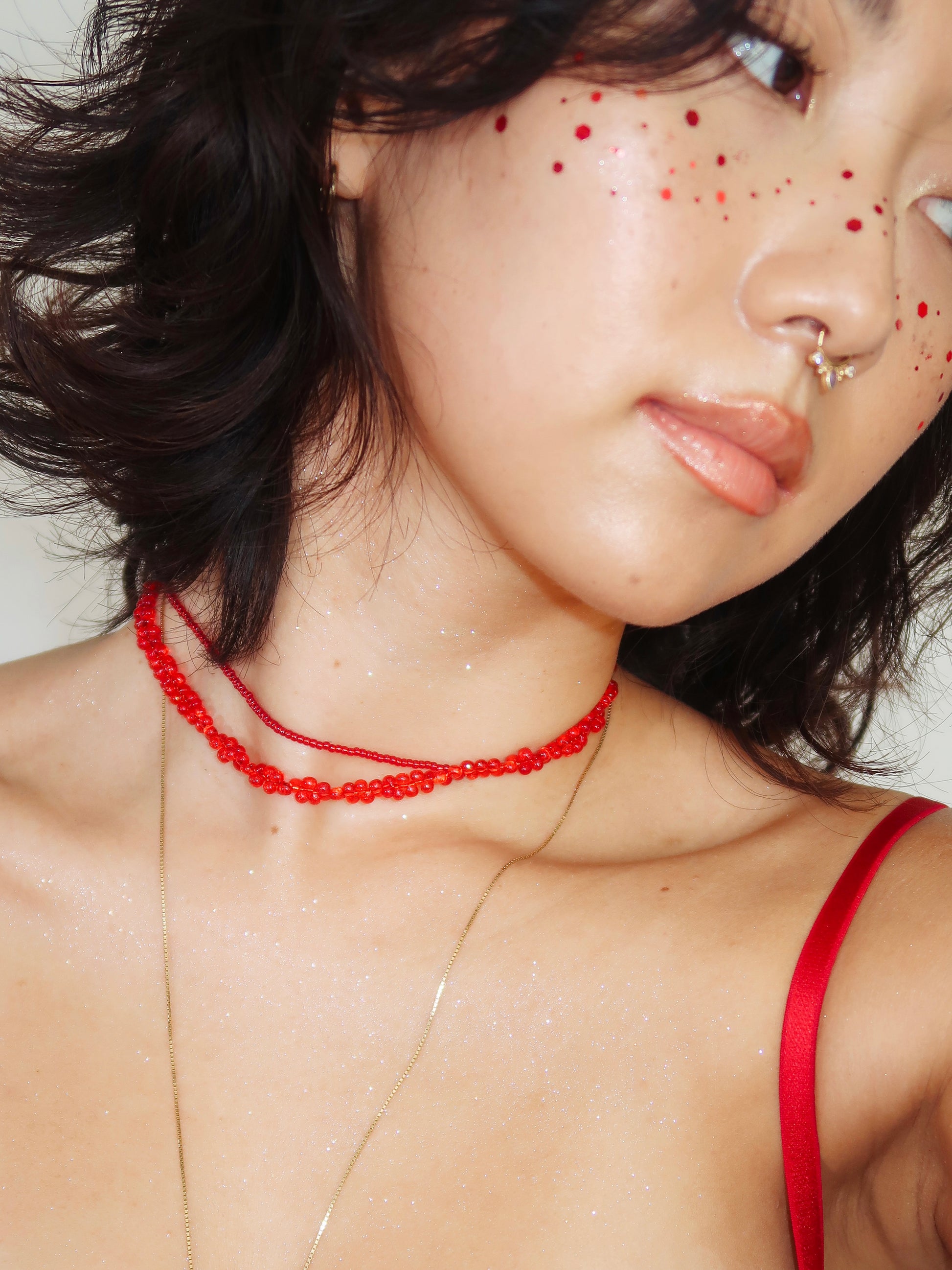 Introducing our best-selling dew choker's dark and alluring sister: The Blood Choker. Handmade with Japanese Miyuki glass beads, this bright red accessory is a perfect addition to your Halloween wardrobe. We have updated the design, making it an inch longer to fit more people comfortably!