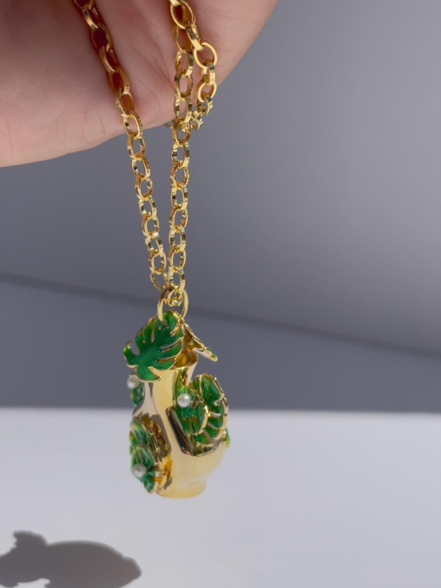 Radiant and exotic, the Tropical Bum Necklace brings the essence of summer to your personal style. Its feminie figure-shaped vase pendant is hand-painted with enamel mostera leaves and crowned with delicate small pearls. The luxurious 14K gold finish offers a bold look befitting of a summer goddess. Don't forget to pair it with the matching earrings, or complete the look with our other Tropical Paradise pieces!